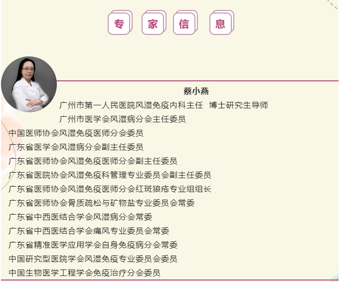 本次活动我们邀请了广州市第一人民医院风湿免疫内科主任医师蔡小燕教授广东省第二人民医院风湿免疫科副主任医师郑少玲教授会为大家进行现场患教。本次活动中,两位教授将会为蝶友们分享SLE用药治疗、儿童SLE疾病管理的相关知识。与此同时,蝶友们还能够获得与专家面对面交流的机会。