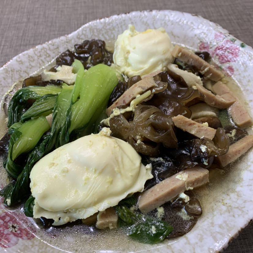 午餐🥣荷包蛋午餐肉炖木耳香菇青菜,午餐肉平时很少吃,这也是老王当天物资的储备。