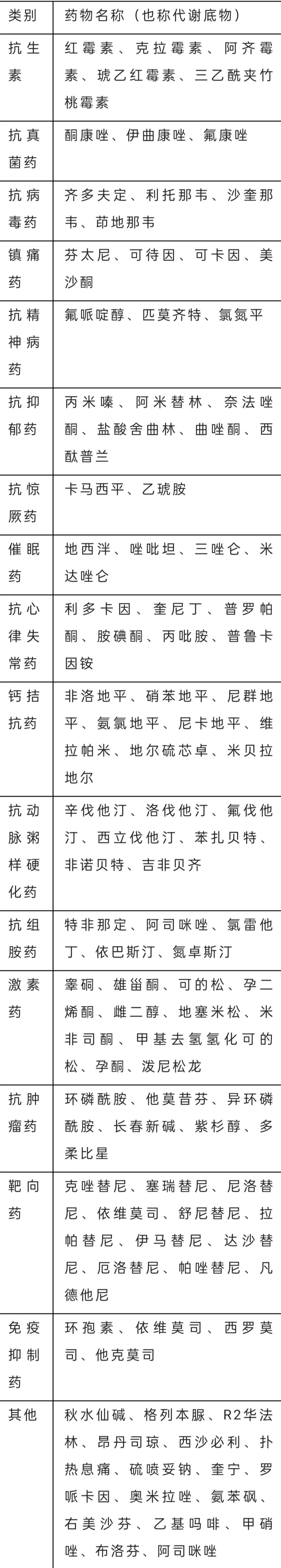 总的来说,临床中一半以上的药物要CPY3A4参与代谢,我们将一些常见的相关的药物整理成表1。