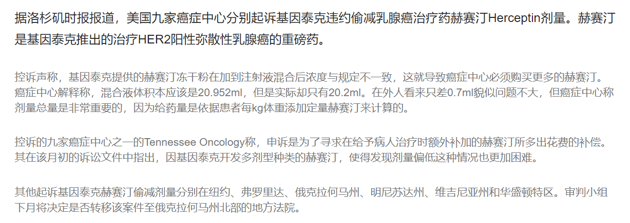 就是说美国人发现赫赛汀配药水的时候偷工减料,差了0.7ml,虽然说0.7ml不多,但是咱们用多少药都是计算过的,长年累月这样子,不知道会不会影响疗效