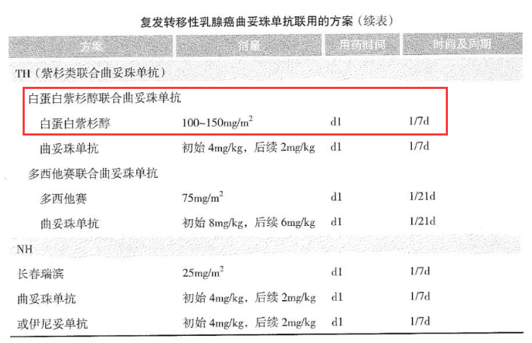 化疗第1天予以白蛋白紫杉醇静脉滴注100~150 mg/m2;曲妥珠单抗首次静脉滴注的剂量为4mg/kg(化疗第1天),之后改为2mg/kg,每7天为一个治疗周期。