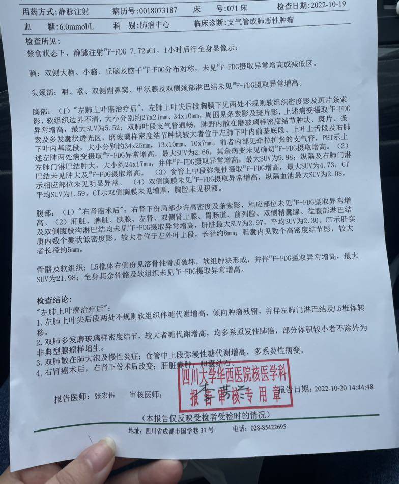 从5月份确诊,到现在快半年了,爸爸做了15次放疗(包括3次sbrt ),化疗了3次(培美 卡泊 贝伐),今天去拿了2次化疗后的派特Ct,医生书主病灶基本控制住了,还有一个就是放疗过程中出现的肺门转移,腰椎出现了一个转移,之前做的骨扫描个腹部增强都没有,其他还好,医生评估SD,由于我爸的基因突
