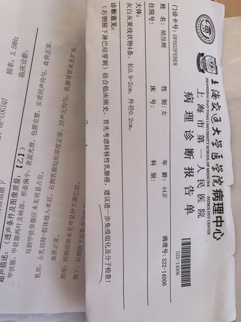 首先考虑转移,但不确定?又交钱做免疫和分子分析。我的主任医师手诊认为不是坏东西,这两天因为胆囊炎痛吃了两天阿莫西林,感觉腋窝的包小了点,可能就是炎症呢?再等一周出结果。