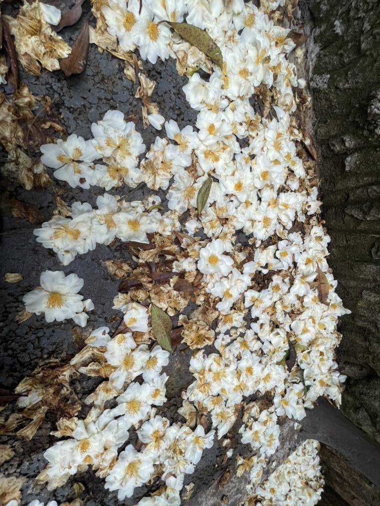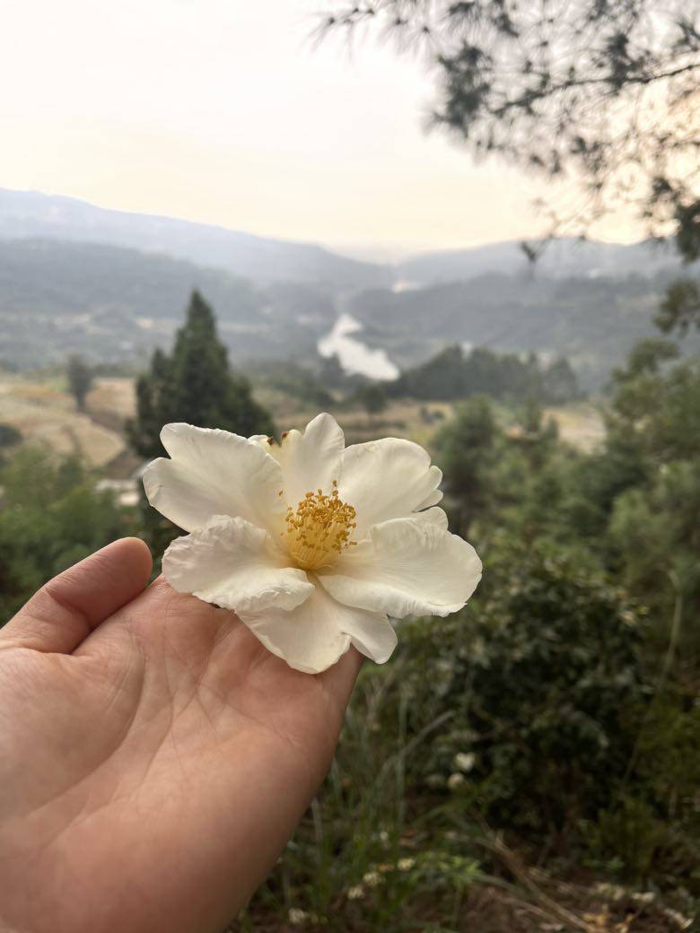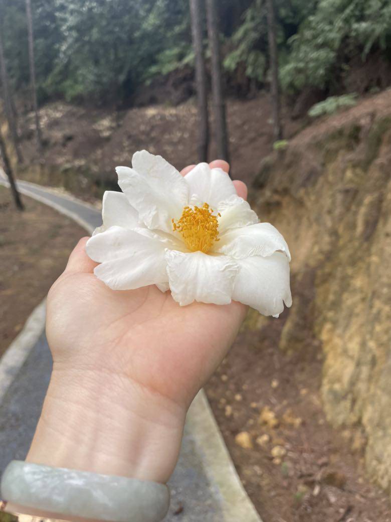 十一月份还有几天就立冬了,天气依然像初秋一样,一件吊带加个小西装就能对付。下午去下乡,爬爬山还出汗。这个天气下乡就像去旅游一样,秋天的风景哪里都好看。到处看到落花,我不认识是什么花,白色花瓣如玉般温润,黄色花蕊很亮眼,真漂亮。一路走一路捡。