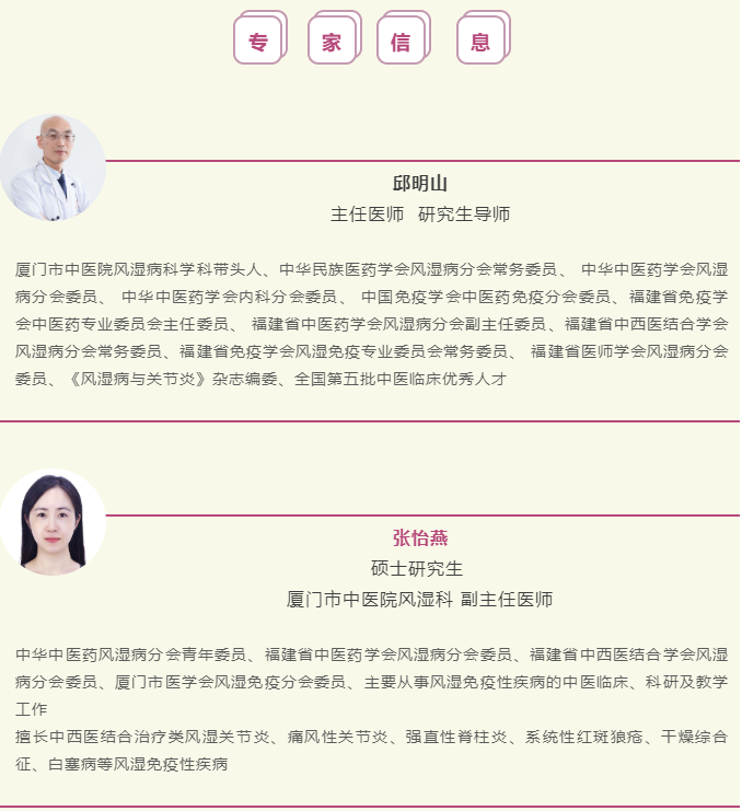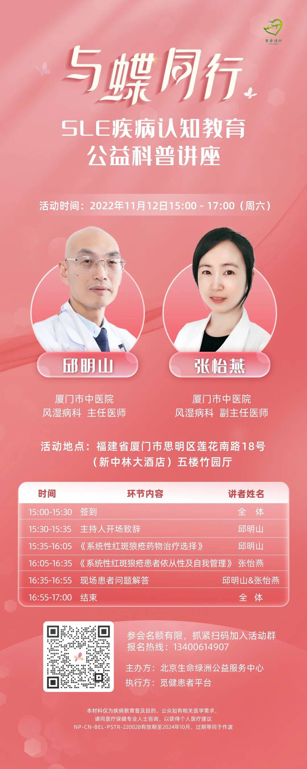 来自厦门市中医院风湿病科的主任医师邱明山医生和来自厦门市中医院风湿病科的副主任医师张怡燕医生将会进行现场患教,为大家分享狼疮药物选择以及患者自我管理的知识。参加的蝶友除了获取狼疮知识外,还能够获得面对面和专家交流学习的机会。现场名额有限,机不容失,快快扫码参加吧!