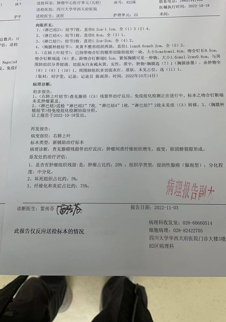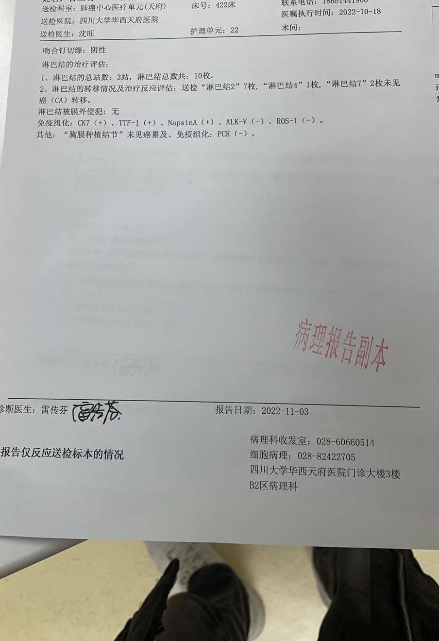 继8月底看了周清华教授由周老师来了入院证明,在家陆续等了1个月接到了负责我沈医生的电话。原本我不在四川,外省入川需要三天三检,赶不上十月前最后一批手术了。沈医生特别细心的让我点先别入院,就算入院了也是浪费住院费要等到十月假期结束,并说会在节后第一批通知我。卧于十月六号到的四川并行核酸检测,在第三次核酸检测完成于十月9ri联系的沈老师他说安排我明天入院,下午便收到了入院通知。十号早上在医院顺利的入了院见到了我的管床医生沈老师,怎么说呢,我没有见过这么好的医生,像一个大哥哥。他仔细整理了我的病例资料,我问他我能治好吗,他回我既然我们把你收下了就会对你负责到底。在十一号做完了一系列的检查通知我十三号早上第三个手术。十三号早上6点50 周清华教授就来查房了,亲切的让我加油并且术后好好咳嗽。沈老师还特地发了个微信给我,让我要加油手术间见!我有一种莫名的感动,下午两点钟的时候我被推入手术室候诊,大概等了2个多小时吧。反正麻醉口罩我都没撑得过三秒就睡着了。术后我发现我竟然没进icu直接推回病房了,医生说我进行得很顺利各项体征很好不用去icu了。术后第六天我出院前前后后一共住了九天,过程一切顺利。回到租房的第一天拿掉镇痛泵我不习惯,疼了两夜没怎么睡好觉,后来习惯了之后也就好了。术后十二天我去看了沈老师的门诊,他告诉我伤口恢复的很好可以回家等病理报告并且给了我一个拥抱让我好好恢复。今天是我术后的第27天,我手术部位有麻木感,睡觉睡的有点憋,而且咳嗽。这些都是术后常见的一些症状。之前确诊的胸膜广泛转移,在这次病理报告上没有看到。我也不知道这算不算降期成功,应该算是一个好的开始吧。问诊了赵军主任,他建议我mrd后决定是否停药,我不敢呐 一切等到mrd结果出来再说。我能一步一步走到现在这样,我离不开老婆家人的支持,老婆对我几乎如影随形。谢谢她默默无闻的付出,感谢蔡老师合群里的各位大神,各位鼓励 指引我的哥哥姐姐。下面的路还很长,我想走的很远很远…