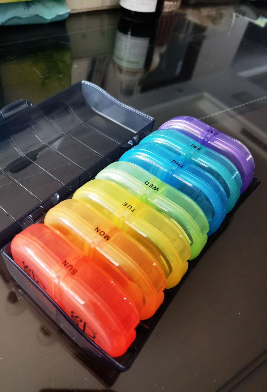 我专门买了一套药盒,一共七个,每个药盒分早中晚睡前4个空格,每周一早上开始剥药,到点了就吃,这样不会漏更不会错,咱们这些药不比感冒药,可不能吃错啊