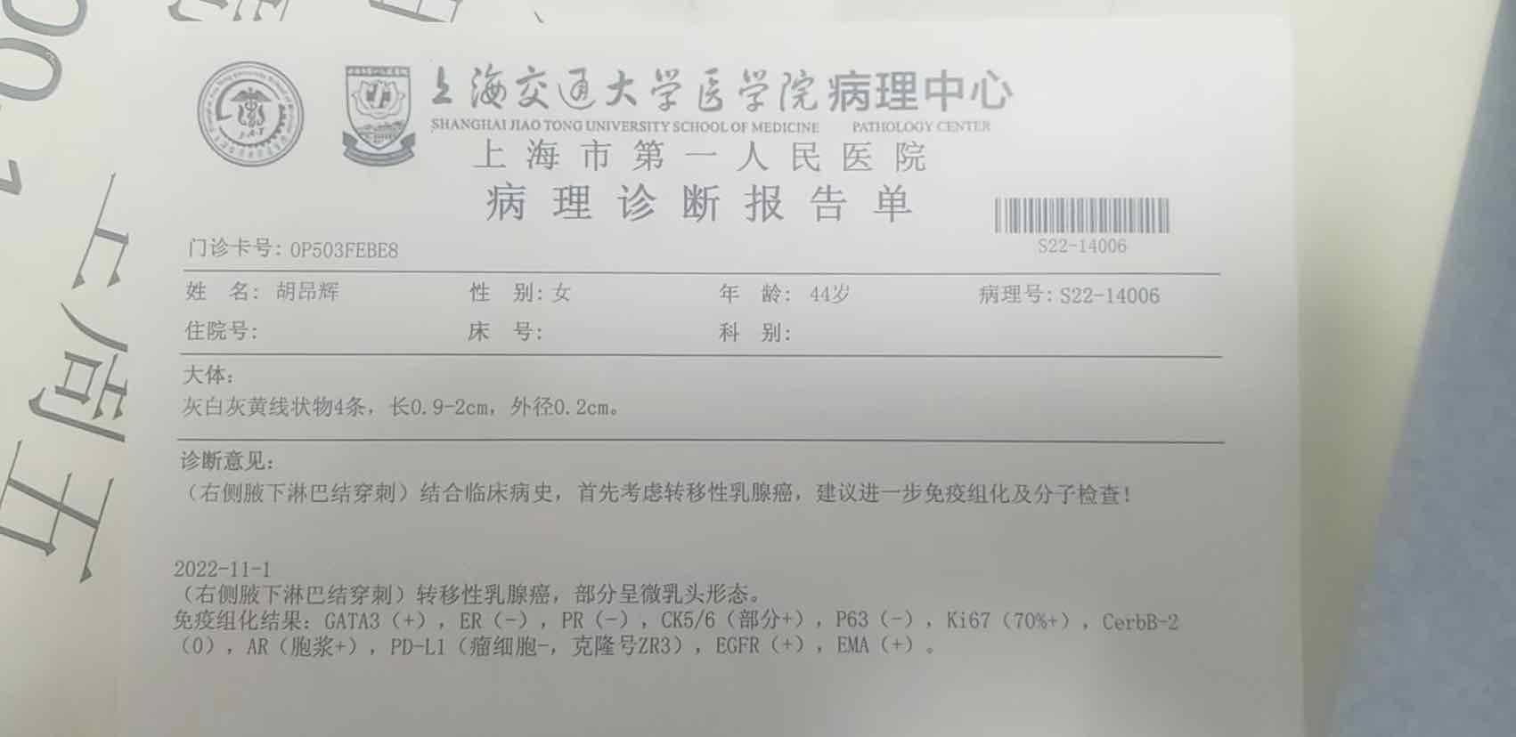 仔细看了一下我的病理报告,免疫组化检测中多了一个PD_L1的报告,这是之前没有的,几年时间医院病理科也在不断完善,外科主任说只可惜这个数值是-,一般来说我打PD_L1不大会获益。