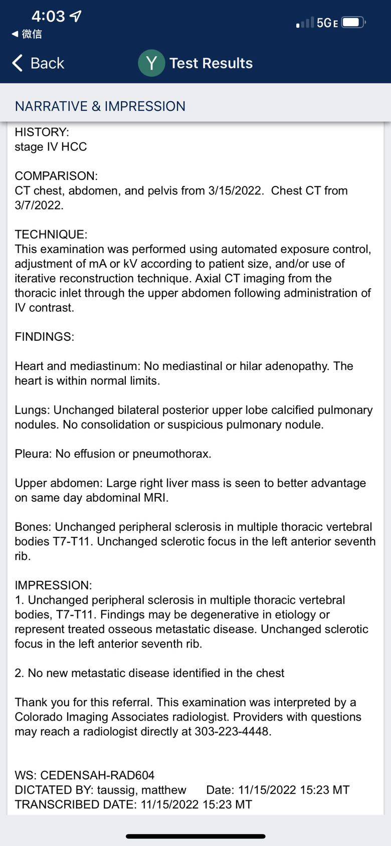 2,CT显示原来怀疑骨有转移位置并无新的进展,相当稳定。