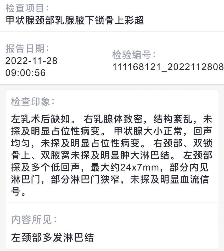 三个月的小复查,彩超和验血,除了查出颈部(下巴处)多发淋巴结有点小担心,还有胆固醇偏高了一点点 ,妇科肌瘤及囊肿还变小了挺好。验血报告总体不错。
