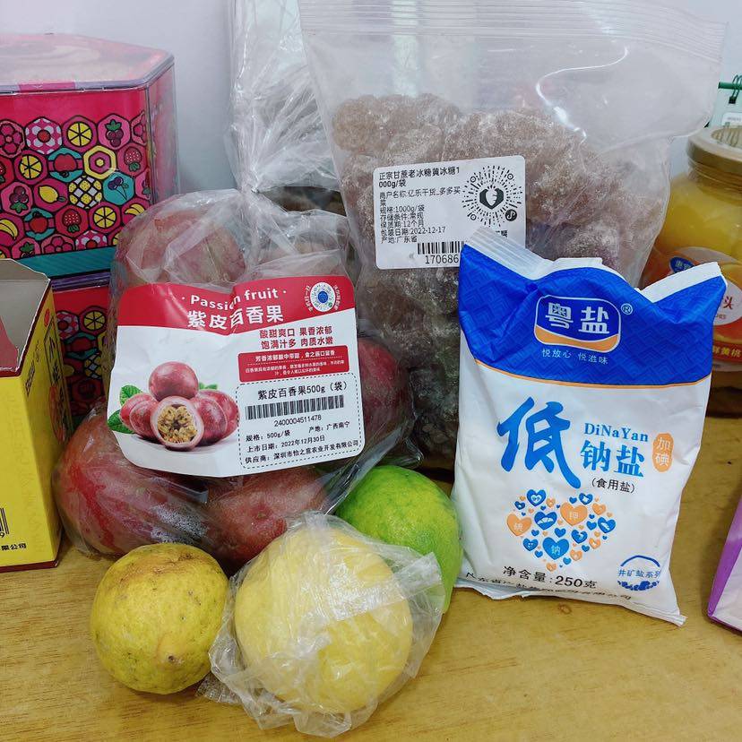 昨天去朋友家,朋友送了几个柠檬给我,还教我做果茶,今天就顺便买齐百香果,黄冰糖和盐,试试看能不能做出来哈哈哈