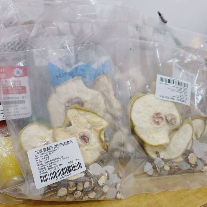 朋友说她阳的时候老咳嗽,就买了那种速成包煮水喝,是甘草雪梨干的,我买的有冰糖在里面的,就省得自己加糖,不知道好不好喝