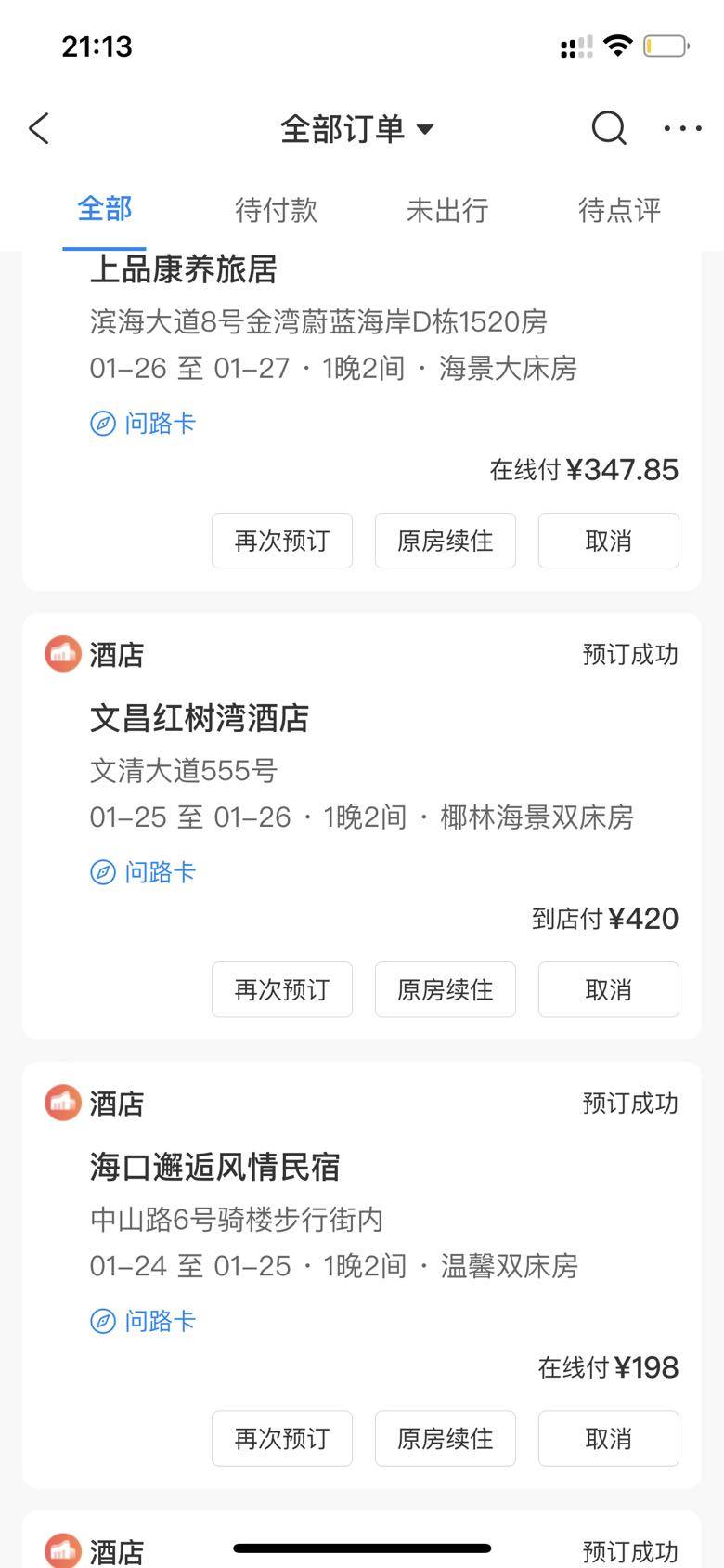他们答应后我把一路的酒店都订好了,昨天拒绝我的同时把春节外出这趟也否决了。他们不去了,我的计划也只能跟着变了,首先得去取消我的全部订单。