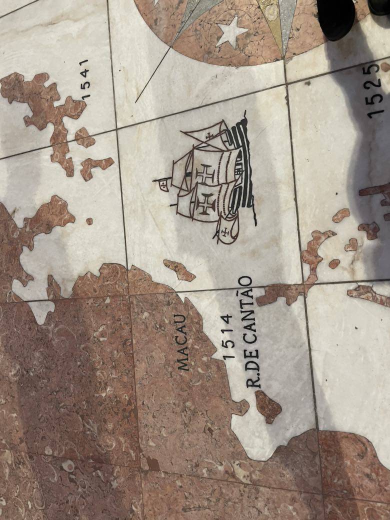 纪念碑广场地面是世界地图,上面标记着葡萄牙船队到达世界各地殖民地的时间。这里可以看到,到达Macau,就是澳门,的时间是1514年。随着1999年澳门的回归,殖民主义的历史残留终于灰飞烟灭。殖民主义在道德上是滔天罪恶,但大航海时代劈波斩浪的勇气,智慧和坚韧不拔,却成了全人类的精神财富。以前中学课本学过的,首位从欧洲航行到印度的达伽马和首位进行环球远航的麦哲伦都在纪念碑上占有一席之地。