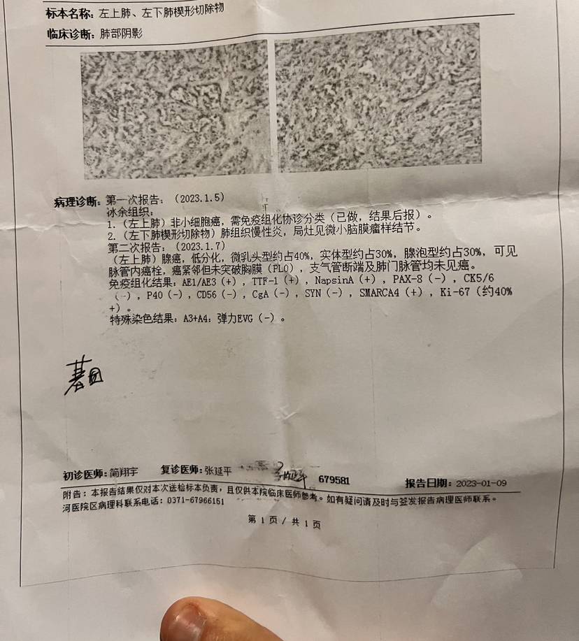 2023.01.05 术后病理显示,确诊为肺腺癌,低分化,微乳头40%,有脉管血栓,一组淋巴结转移,pD-L1表达70%。