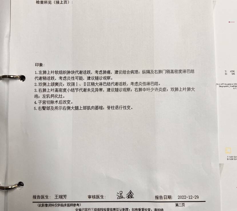 2022.12.29 经各科会诊后,高度怀疑是肺癌,术前分期前中期,有手术指征,建议立马安排手术。
