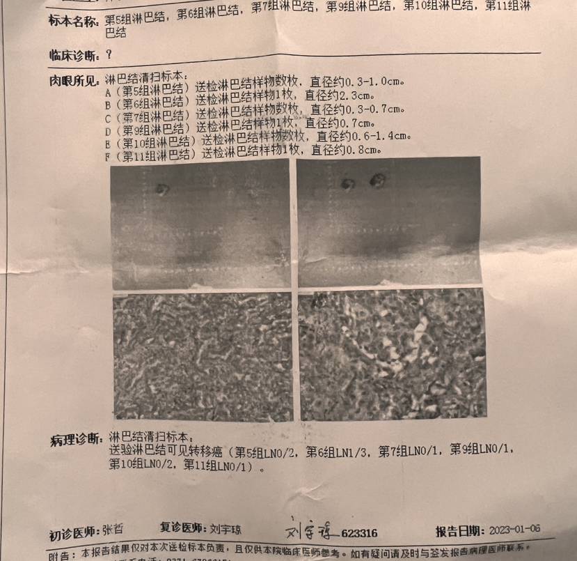 2023.01.03 进行了肺叶切除根治术,淋巴结清扫术,胸膜黏连烙断术。术中发现有一组淋巴结转移。