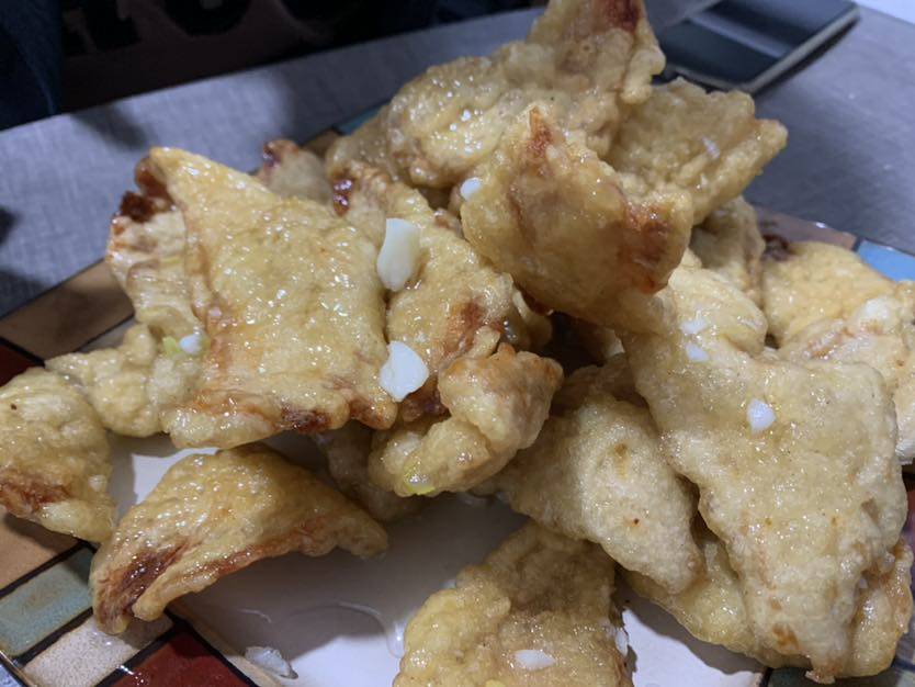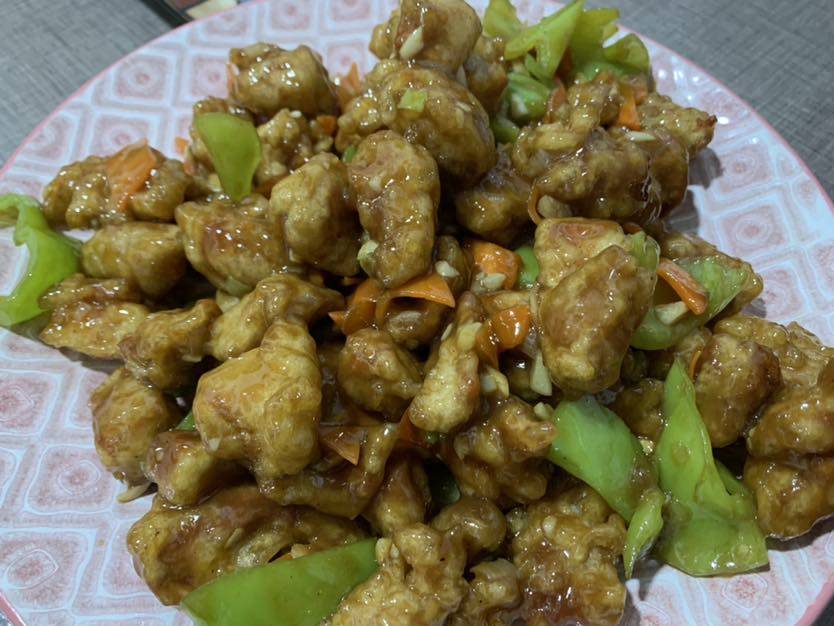 锅包肉,单位旁边的饭店做好拿回小厨房吃,自己买的猪里脊肉,拿去加工的。