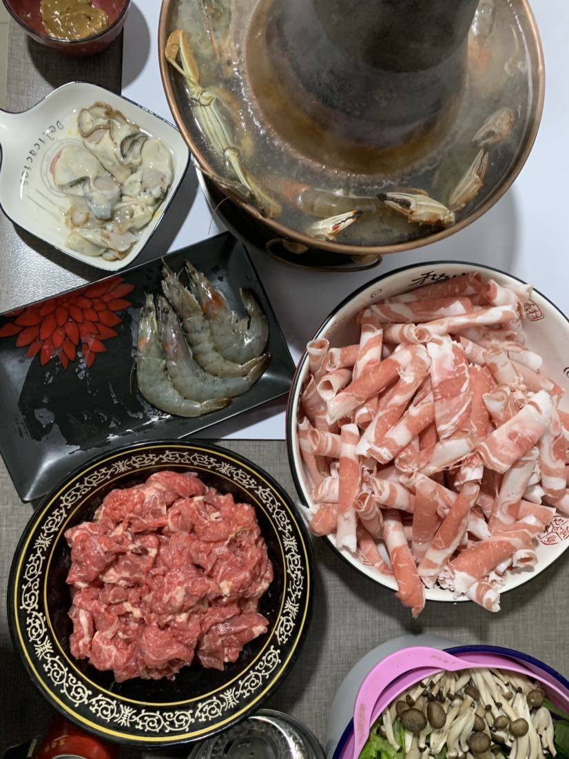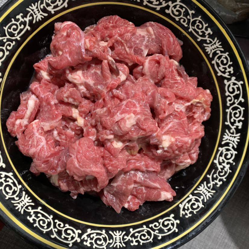 在家烧炭不方便,于是晚餐在单位小厨房吃的,因为单位门口烧烤店有碳,烧好后放锅里方便。手切牛上脑