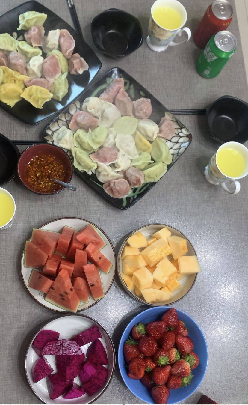 故意的乌龙茶五彩水饺和水果,看着就有食欲,还有诱人的火锅呢,太赞了👍