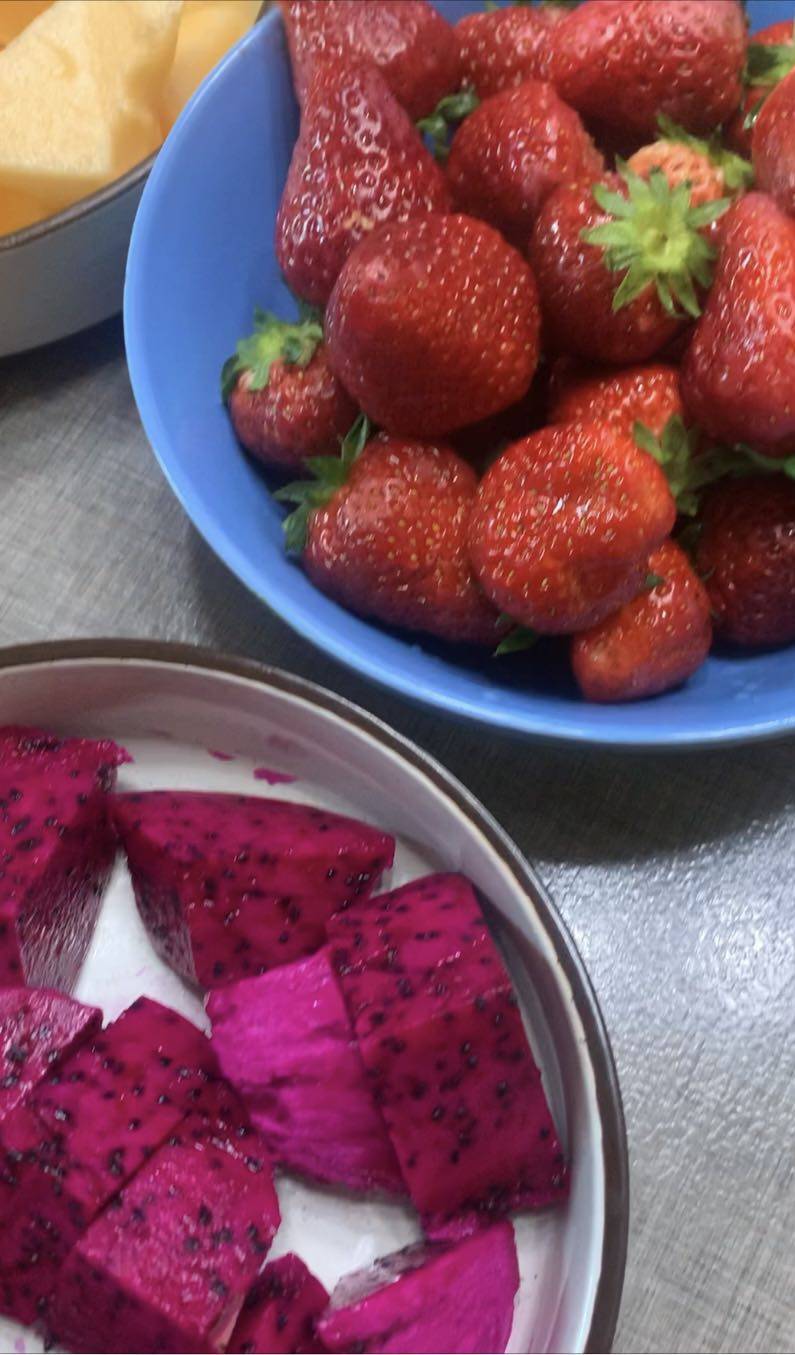 水果是两餐之间吃的,草莓🍓和红心火龙果