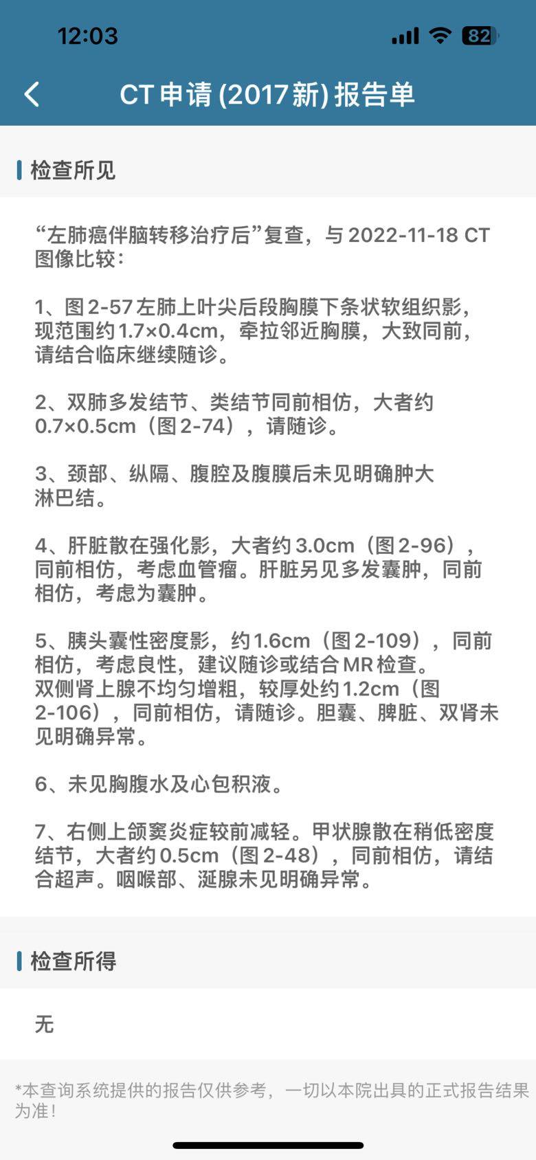 复查结果同前,一毛一样,即没有新冠引起肺炎,也没有因为新冠把病灶烧掉(是我白日做梦了),不大不小,一直在那里不动。