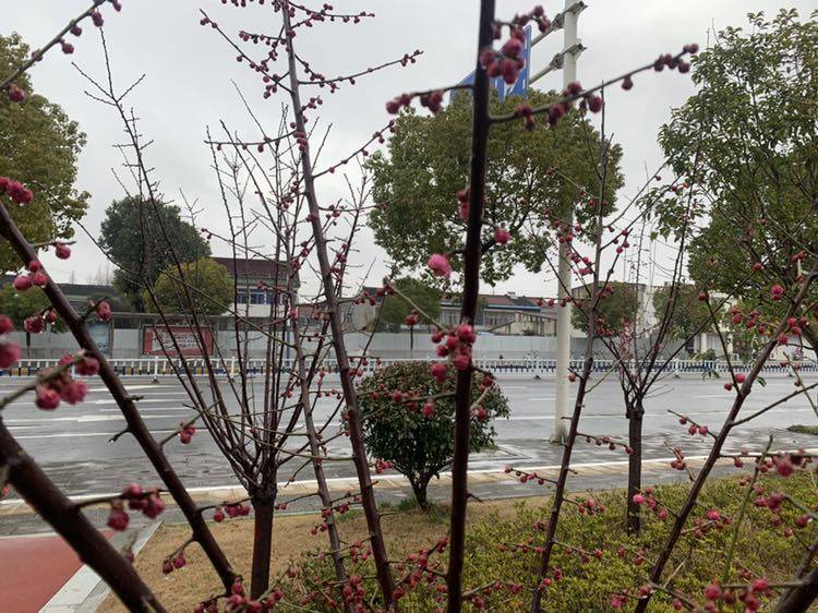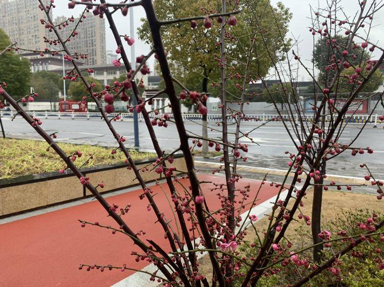 今天早上去超市买菜,把买好的菜放在寄存柜子里。去公园逛逛,反正又不远。十几分钟就到。下雨天,公园里散步的人稀少。我想要来看看那些红梅花。走过凉亭,径直往前走。有一棵红梅在雨中绽放着,带着雨珠,带着春天的气息。我上前闻了一下,心里好舒服。