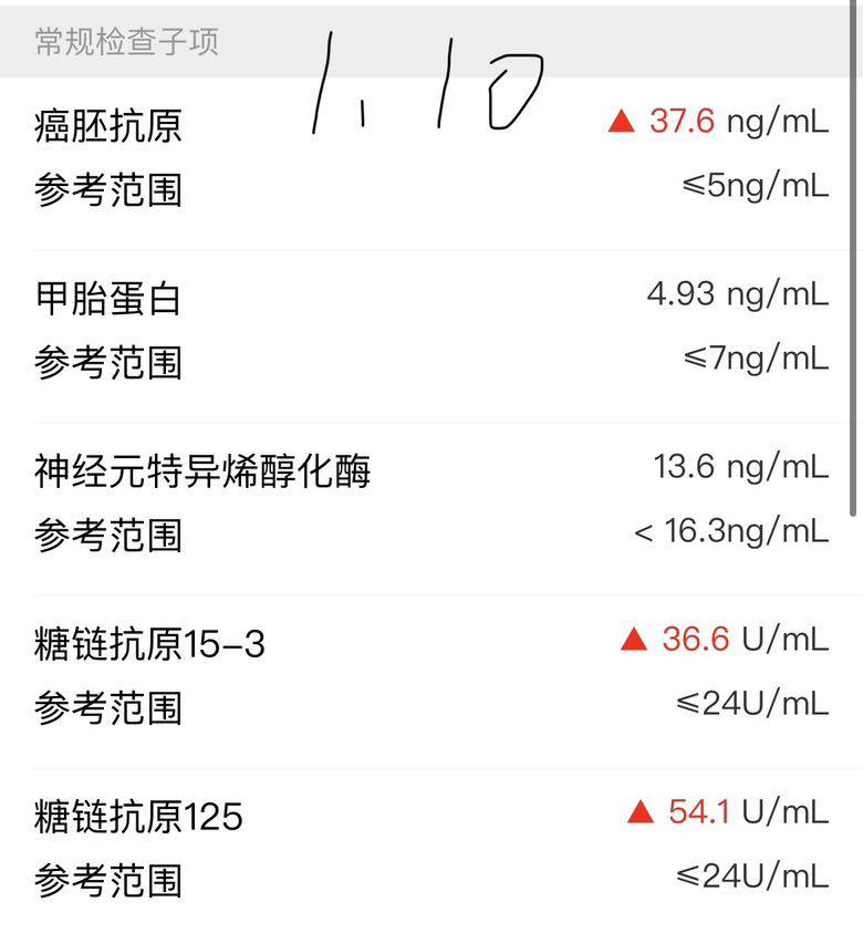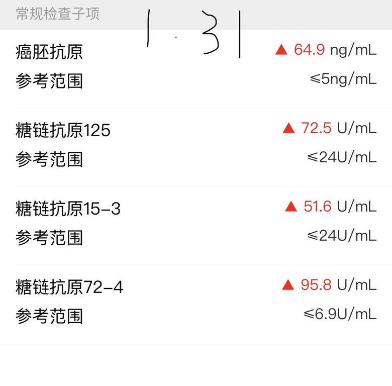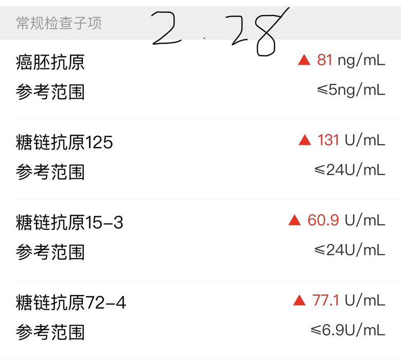去年9月份做的最后一次化疗,11月底,肿标一切正常,都在正常范围值内,新冠盛行的一个月(12月)没去医院查血,1月10日去复查,几项肿标上升,ct显示还较前退缩,医生让观察到月底,然后1.31日再查血,还是升高,医生开了20天的口服化疗药,(之前化疗用的培美,这次口服化疗药是紫杉醇)2.28日复查血,还是升高,请问是什么情况?