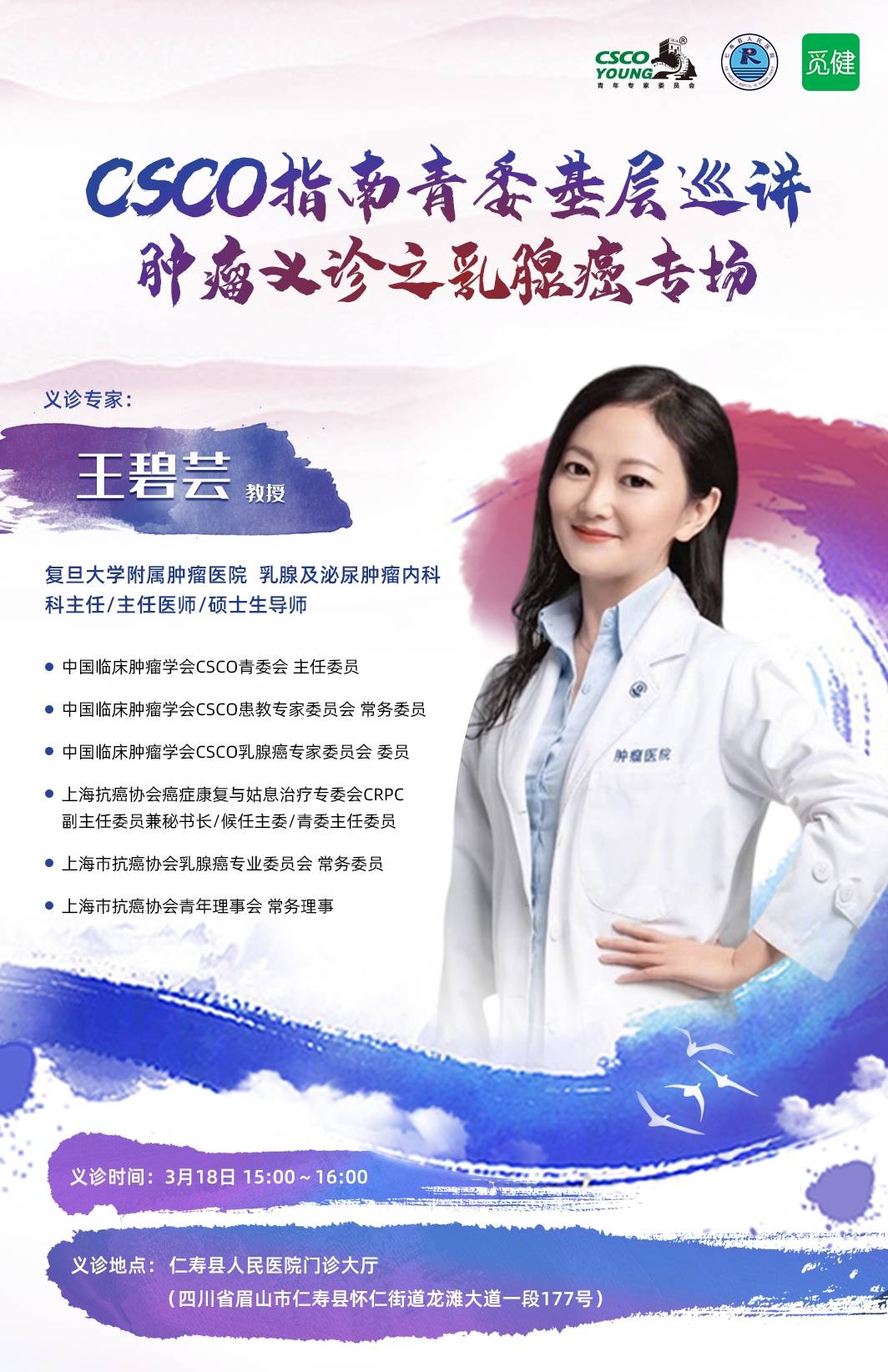 所以为了进一步推进县域地区乳腺癌规范化治疗,由CSCO青年专家委员会、仁寿县人民医院联合发起,觅健协办的“CSCO指南青委基层巡讲--肿瘤义诊”活动,在四川省眉山市仁寿县人民医院举办,邀请复旦大学附属肿瘤医院王碧芸教授、仁寿县人民医院肿瘤科专家共同下基层义诊,免费提供肿瘤问诊服务,让县域的朋友们不用长途奔波,在家门口也能享受到优质专业的医疗服务。