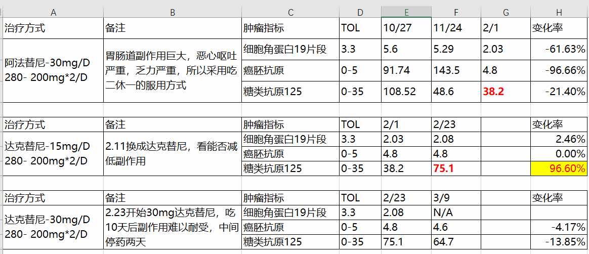 白紫加O不起效果后重回靶向治疗已经四个半月。cea重回正常值,ca-125仍偏离正常值。CT显示平稳状态。目前阶段碰到的最大问题是靶向治疗的副作用。
