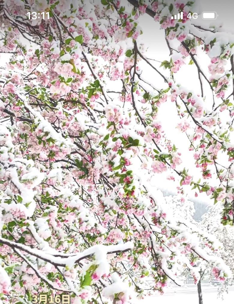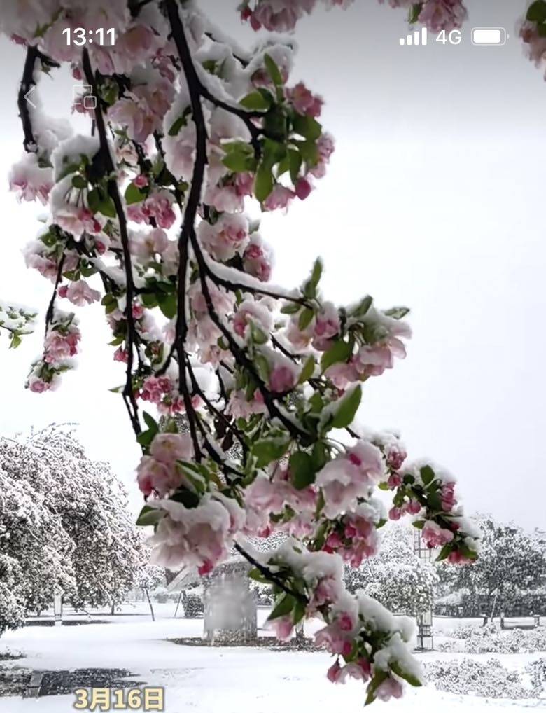 本来想着下得大雨,没料到早上八点多雨中开始飘雪,慢慢越下越大,纷纷扬扬下成了鹅毛大雪,前段时间温度接近30度,各种春花都已盛开。这一下雪,成就了出乎意料的美丽。