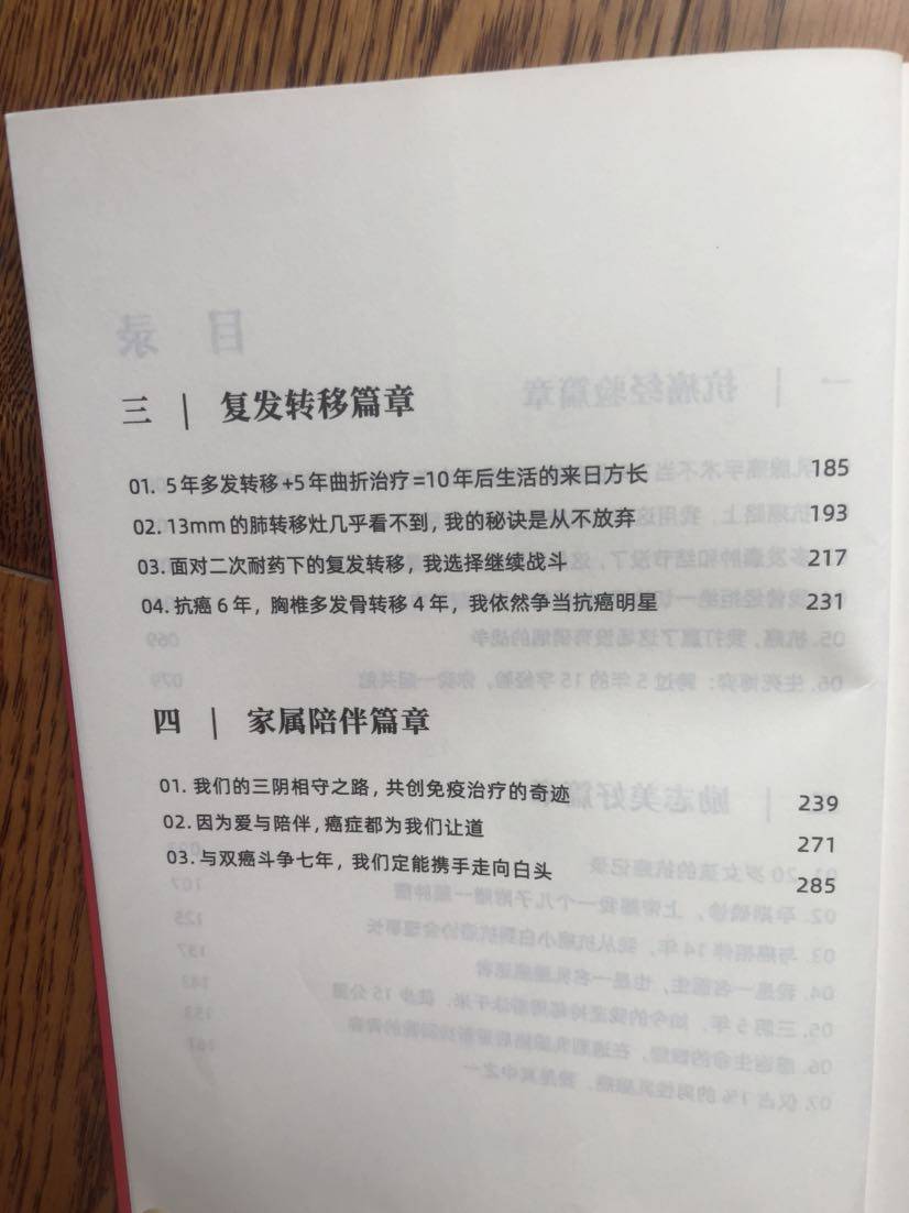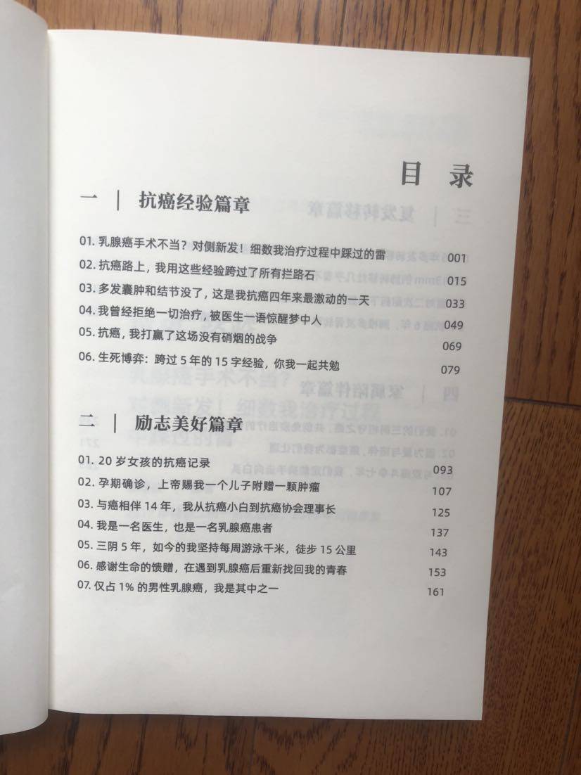 共分四个篇章,一、抗癌经验篇章;二、励志美好篇章;三,复发转移篇章;四、家属陪伴篇章。