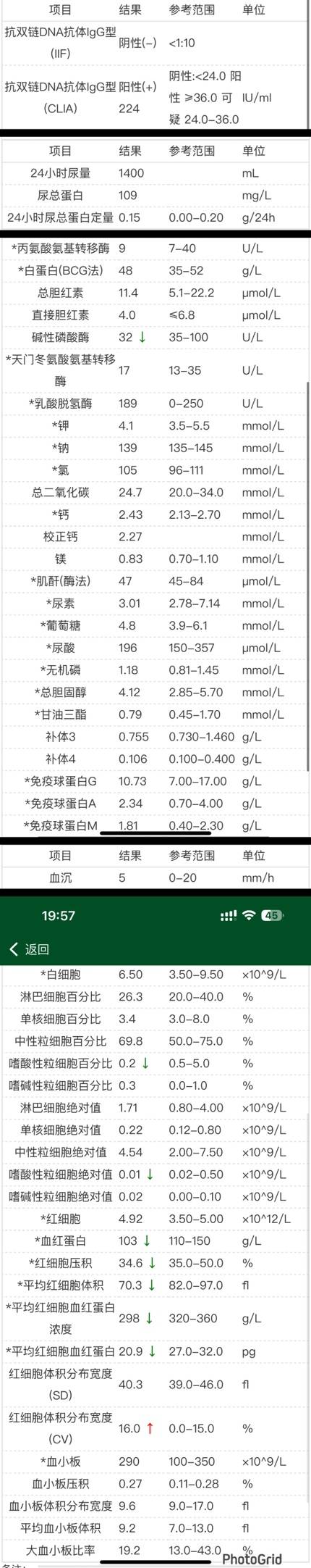 然后医生接过我的化验单就直接说“你抗核抗体阳性啊 抗磷脂也阳性 血沉也高 尿蛋白(0.13g)也一般,你这没控制住啊。” 当得知我激素还刚刚减到一片的时候,她提高嗓门“谁让你减激素的啊 谁让你减的,你这都没稳定呢!” 我当时真有点慌了,然后手都抖了问道 “那有什么治疗方案吗” 这位医生十分笃定的说“加激素加到两片,加上阿司匹林 一片就行外面药店有卖的,然后打泰爱吧” 我说我尿蛋白八克多的时候我没有打泰爱 吃药也控制住了,现在的情况就必须要打了吗? 医生说“打泰爱你才能控制住稳定病情并且尽早停掉激素!” 我说“那我这种情况要是想备孕吗替换成别的行吗?” 医生:“打泰爱!打泰爱了可以慢慢停了吗替。”
