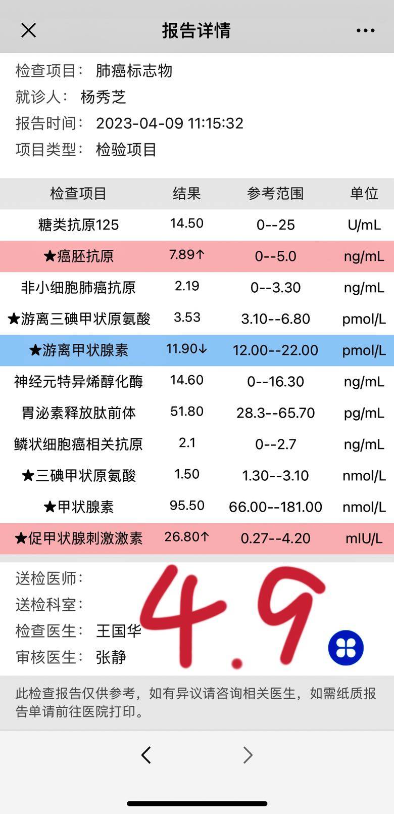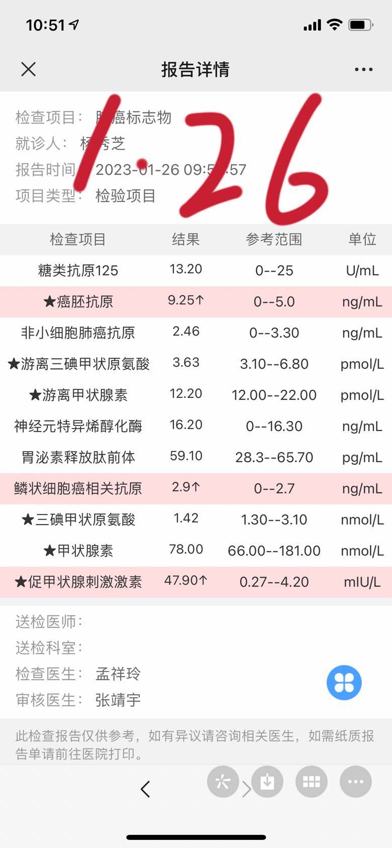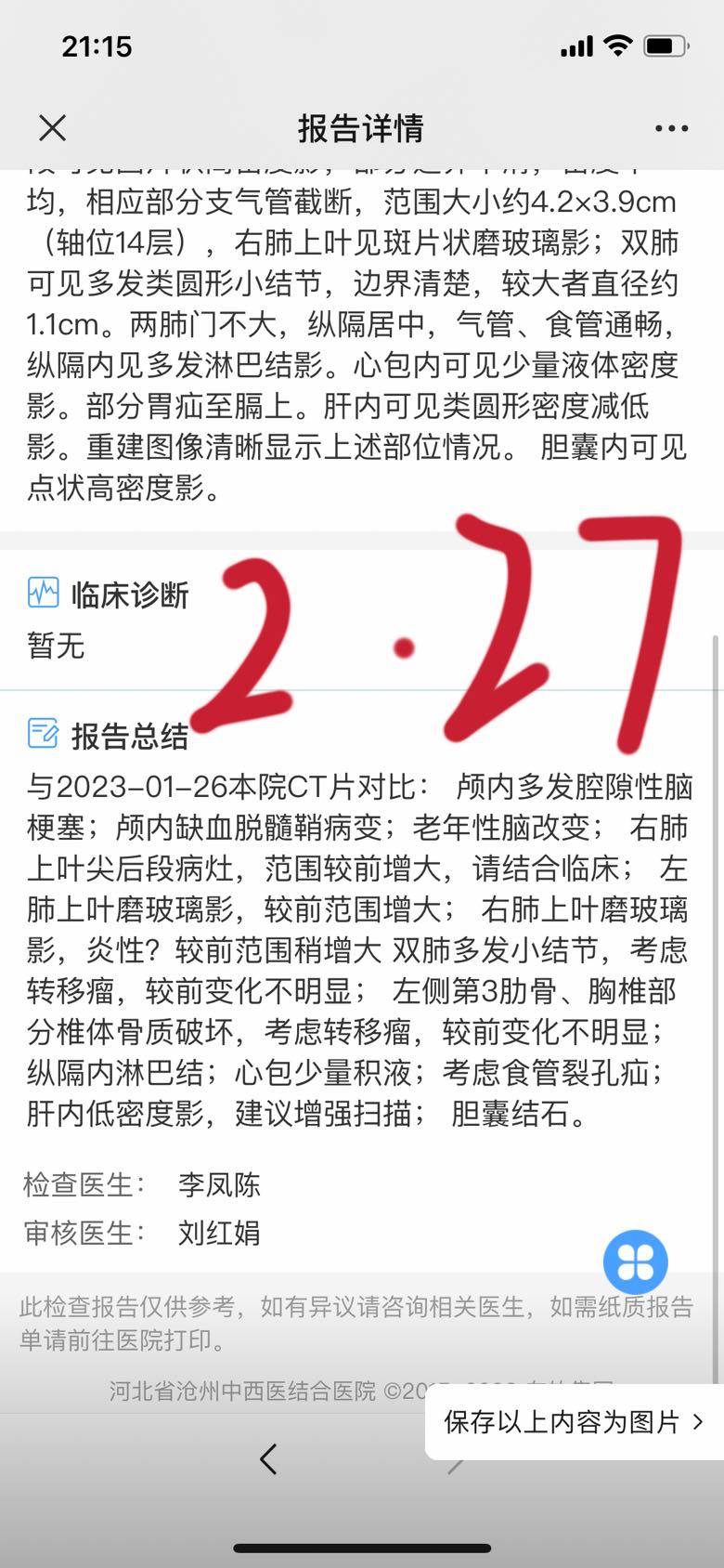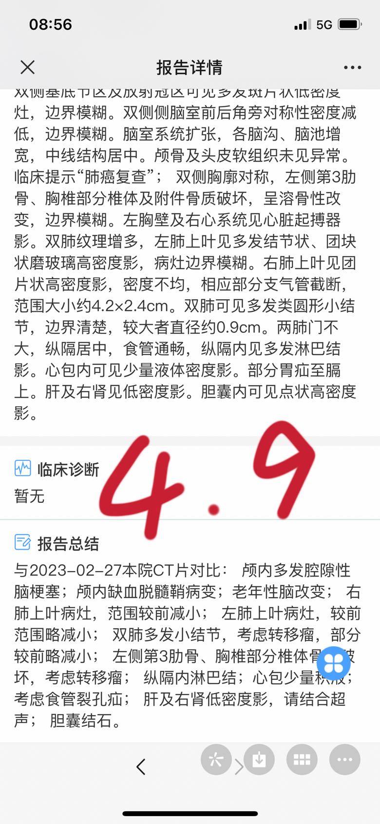 妈妈从新冠恢复后一直体感不错,新冠后CT复查,除了有点炎性其他稳定,直到2🈷️27日感染了甲流,咳嗽得特别厉害,带去医院做了CT,其他检查都没做,CT报告很不好,双肺都有增大,当时第一反应是不是阿法耐药了,小伙伴们肯定能了解我当时的心情……甲流持续了差不多10天(期间在家输应对甲流的药物),妈妈体感又恢复了,有力气,食欲好,也不咳嗽了,能做简单家务,我就想着过一段时间再去复查看看,直到昨天才去复查,复查的结果特别好,CT显示双肺阴影都有缩小,连新冠后发现的炎性阴影也消失了,(肾多了一个低密度影,医生说像肾囊肿)CEA也在下降,看来2月底的增大就是甲流的原因,感谢所有神灵庇佑🙏。
