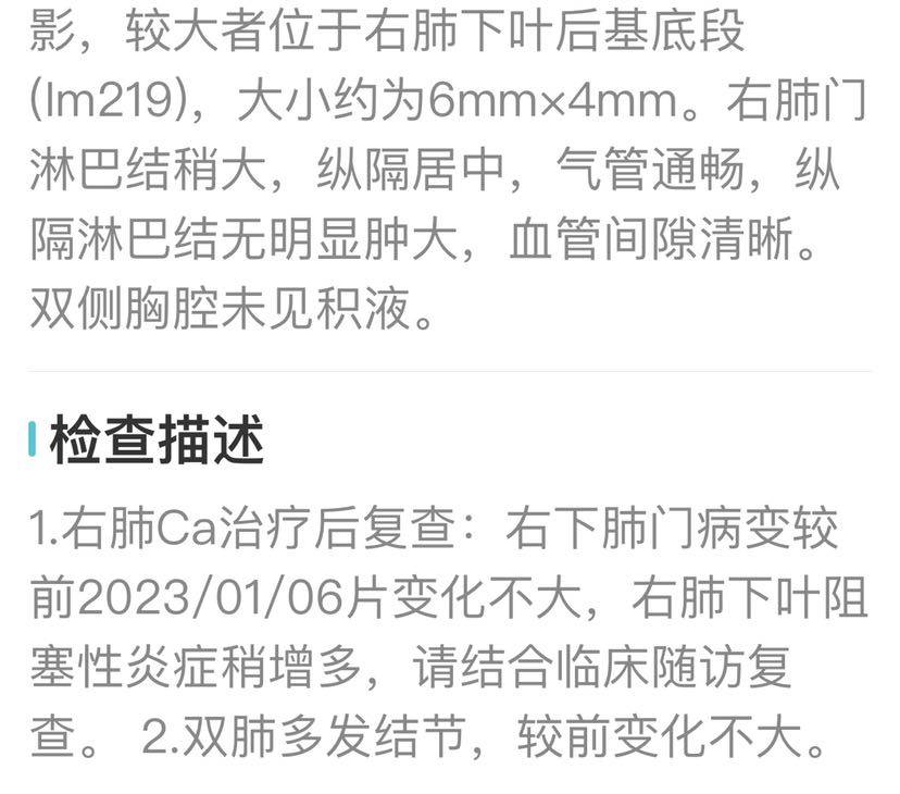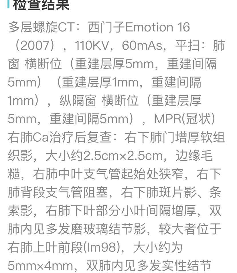 现在就希望一直控制住,不要增大,不要转移。最近妈妈心情比较好,本来打算去旅游,但目的地海拔3000多米就放弃了,怕高原反应对肺不好。