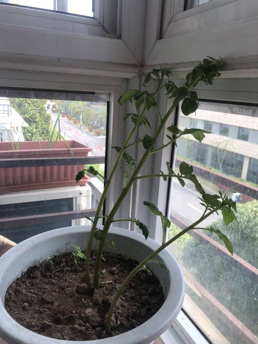 花盆种土豆太小了,应该换个大盆或者桶,这样才能长大,长多