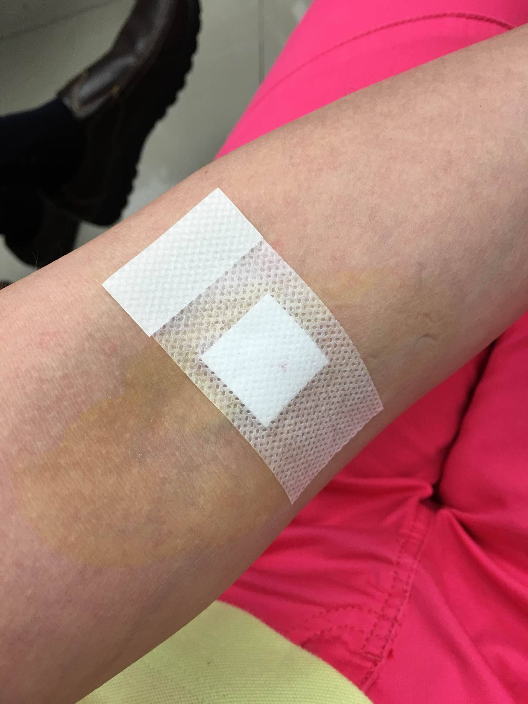 抽完血,帅哥医生给我贴了一个大大的胶布压针眼,新式武器!