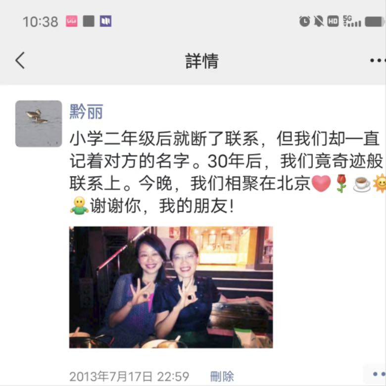 通过班长我联系上了我那时候最好的朋友,她已定居北京。我惦记着她,她也仍记得我,儿时的友谊再次延续。13年暑假我带着孩子去北京旅行,我们在北京见面了,不是缘份怎么可以实现!