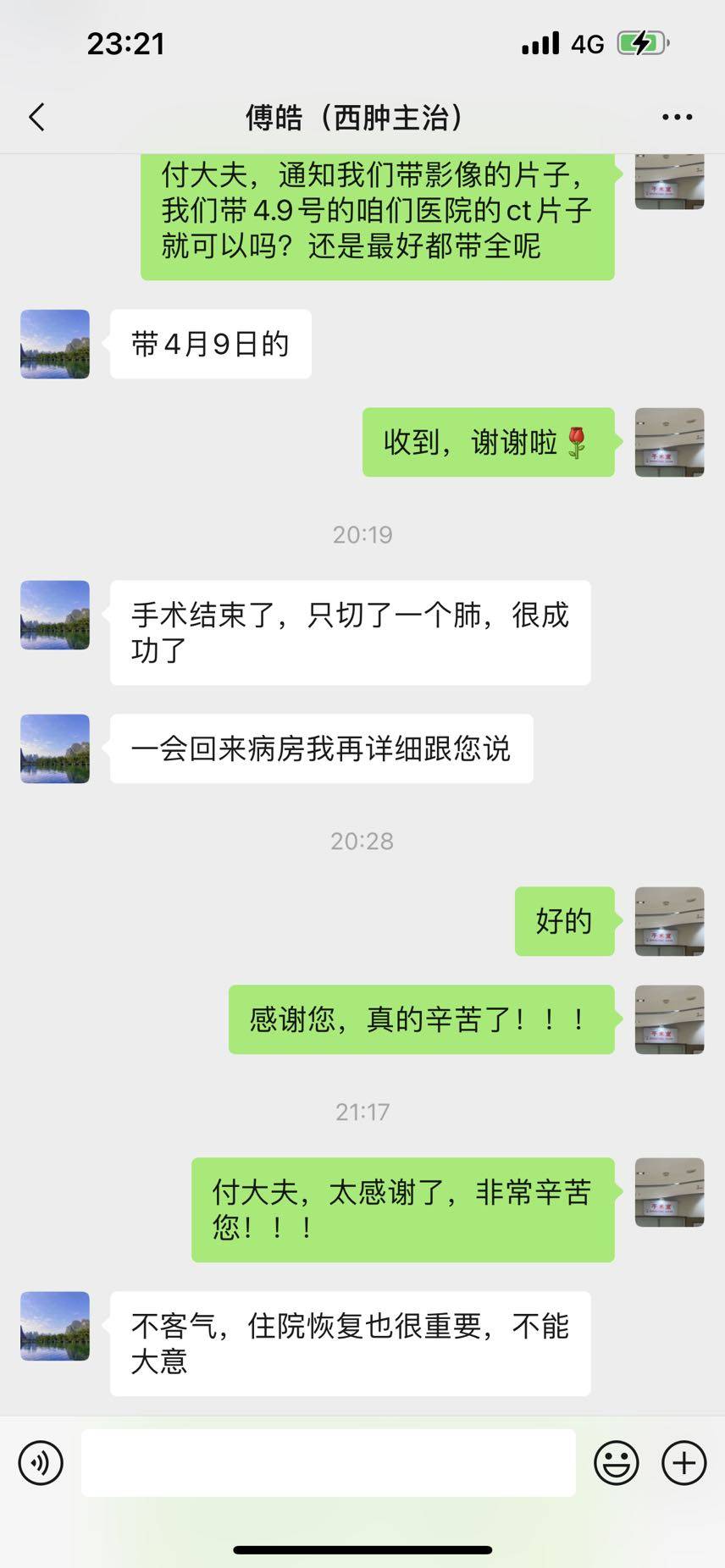 经历了从早到下午的漫长等待,我爸终于在16点的时候推进了手术室,临进去前还仰着头和我开玩笑说我进去睡觉了,睡醒了就回来。然后就是留我在外面百感交集,坐立不安,浮想联翩,每次手术室的门打开,或是电梯门打开推来空床,我都非常紧张和期待,直到20点18分,我心心念念的付大夫给我发信息说:手术结束了,只切了一个肺,很成功了。一会回病房找我详细说。我心落了地,只是最终还是肺全切,不免有点惋惜。20点30出来手术室,我爸就已经清醒了,还和我比划两个手指,我没明白,我说手麻啦。我爸说这是✌🏻️的意思,我的天,我太紧张了。爸爸20点47推回病房一切安顿好。付大夫很快就来了,满脸自豪和高兴,说手术非常成功比预想好很多,剥离时候还是出血了的,但是他们提前预见了,措施采取的好,切除一个肺(他们的一个肺原来是一个肺叶),只有成全肺才是左肺全切,原来是我自己乌龙了。而且采取的是微创,我都快热泪盈眶了,这完全超乎了我的想象,原来的开放式,考虑肺全切,一切都烟消云散了。现在就是等到看淋巴结会不会R0,如果顺利的话可以免除巩固化疗,已经很好了,头上的乌云去了一半。接下来希望一切往好的方向回转。求R0最好,不是我们也不会放弃继续努力。