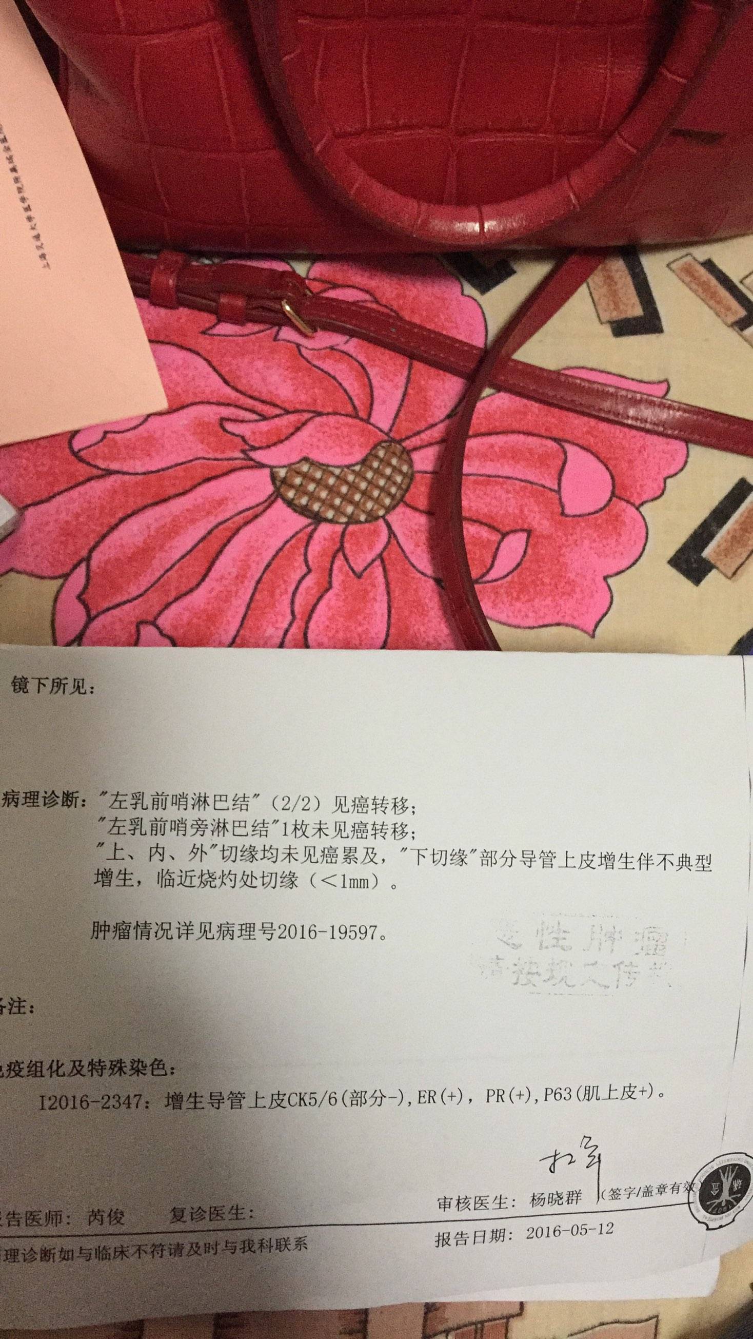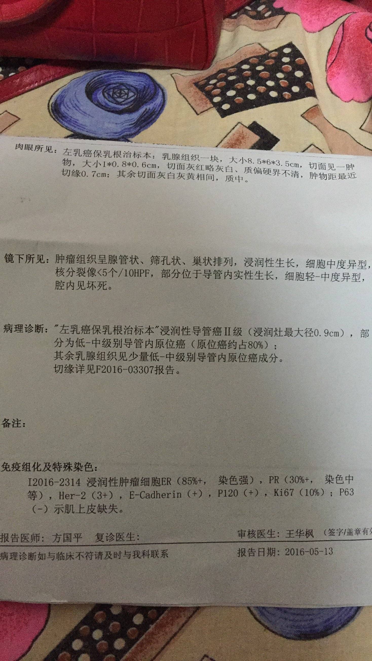5月中旬拿到了自己的病理报告,只知道是三阳,医生告知所有的治疗我都得用上,化疗、放疗、靶向治疗,还有内分泌治疗。