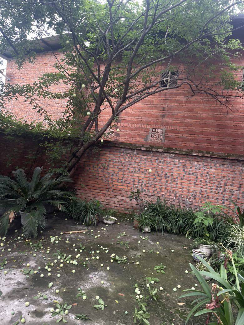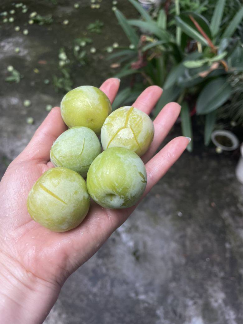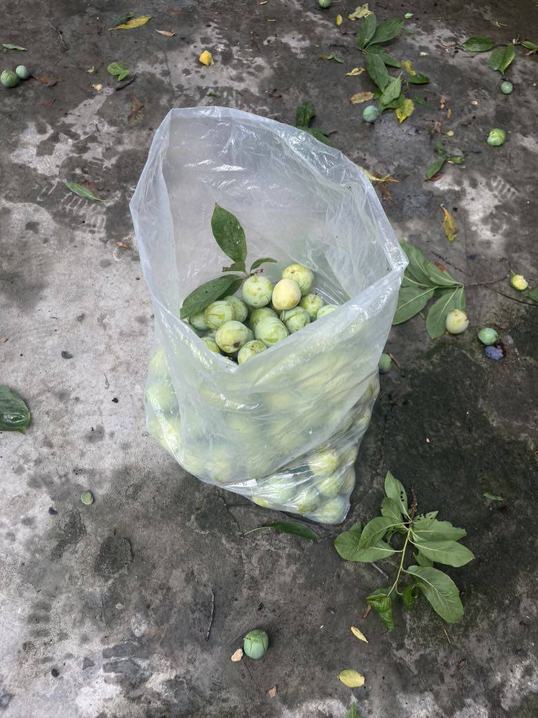 这才阴历的四月初,这个季节李子成熟算早了。我们赶紧驱车前往,果然一棵树的李子还比较生涩,另一棵树上的已熟了。李子树有两层楼高,爬不上去,只能用竹竿打下来。老公在楼上打,我在楼下看院子里下李子雨。只是落在地上全打烂了,捡起来洗了就吃。酸酸甜甜,口味还不错。我一口气吃了十多个。