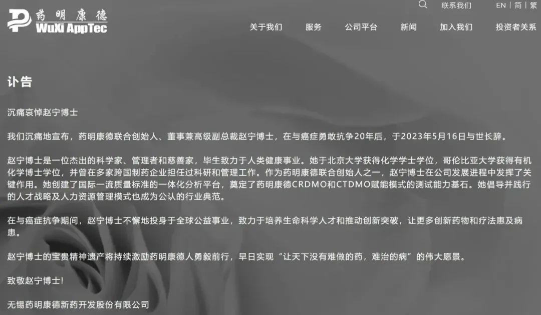5月17日,药明生物和药明康德公告称,联合创始人赵宁在与癌症勇敢抗争20年后,于2023年5月16日去世。