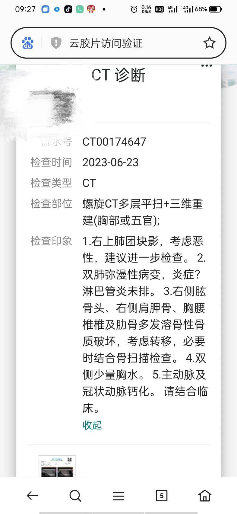 现在在县城的医院住着,医生告诉我后来做了一些肿瘤标志物的检查,显示大概率是小细胞肺癌,如果要继续治疗,做靶向治疗要做基因检测,基因检测有血液检测和组织检测,血液检测没有那么准,概率百分七十左右,组织检测面临的取组织的问题,可以采用经皮穿刺和经气管穿刺,肿瘤位置在右肺上叶,经皮位置不太好取,容易造成气胸,年纪大了气胸也很难处理,他们医院很少做经皮,技术水平有限,要做的话需要去上级医院,气管的他们可以做,但是气管要从口腔或者鼻腔进入,我们担心老人家会很难受,整个过程需要5-10分钟。