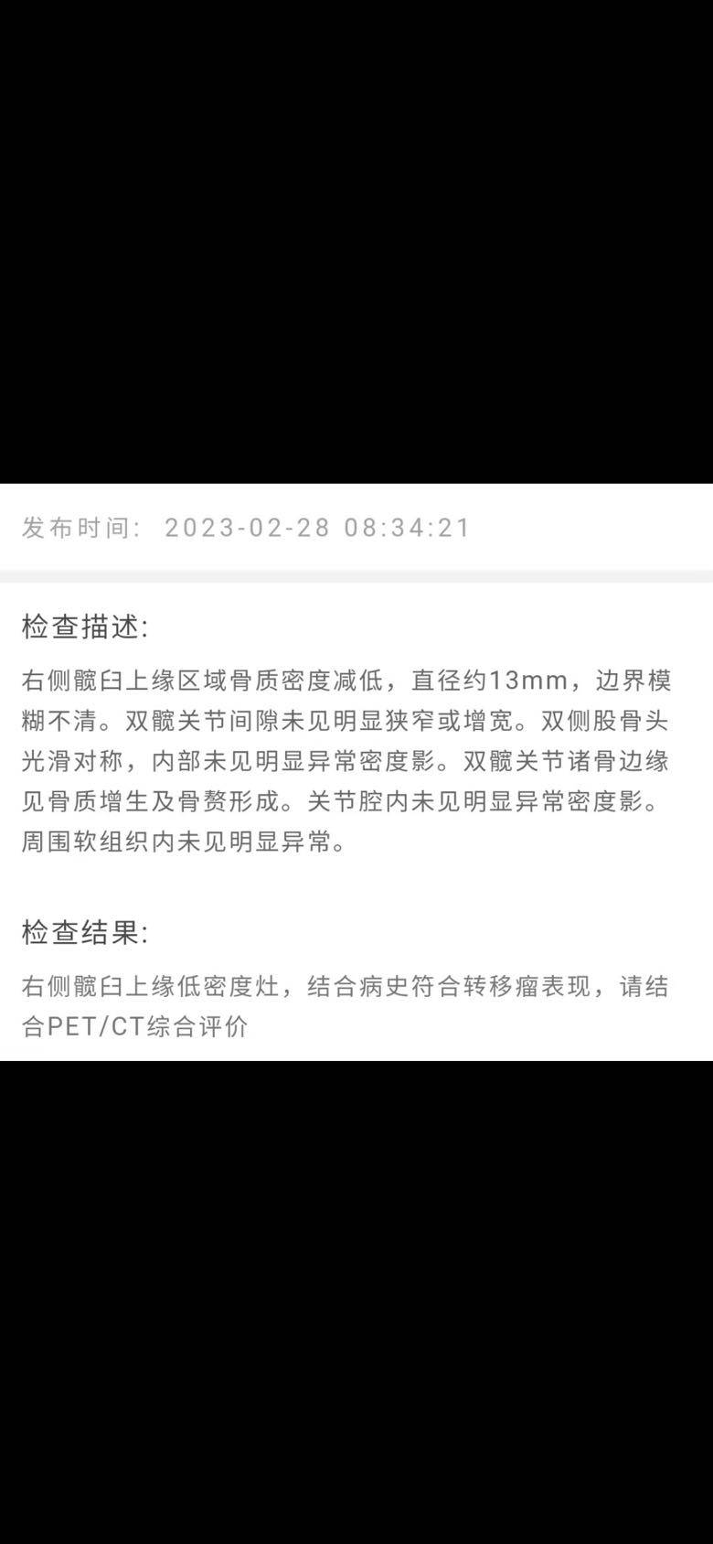 2月底确诊肺腺癌,petct显示右侧髋臼溶骨性骨质破坏,suvmax5.7,随后一直奥希替尼单药治疗,每28天注射地舒单抗。
