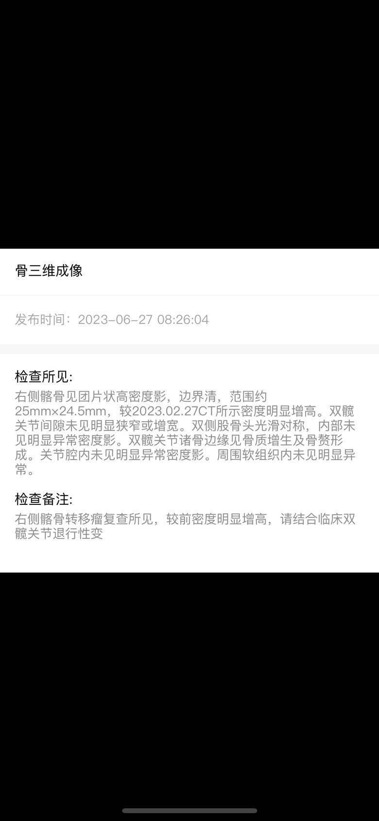 骨转部分一直无痛感,我们也一直在骨肿瘤科随观。2月份的骨Ct骨科专家说问题很轻微,骨完整性也没破坏,对照pet才能看见一点儿问题,还有专家建议我们穿刺活检。3月份和5月份陆续拍了两次骨核磁,病灶大小没有变化,还出现成骨性改变,医生说地舒单抗很有用。