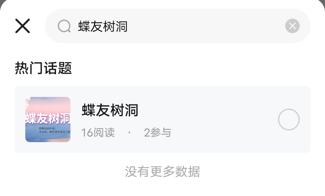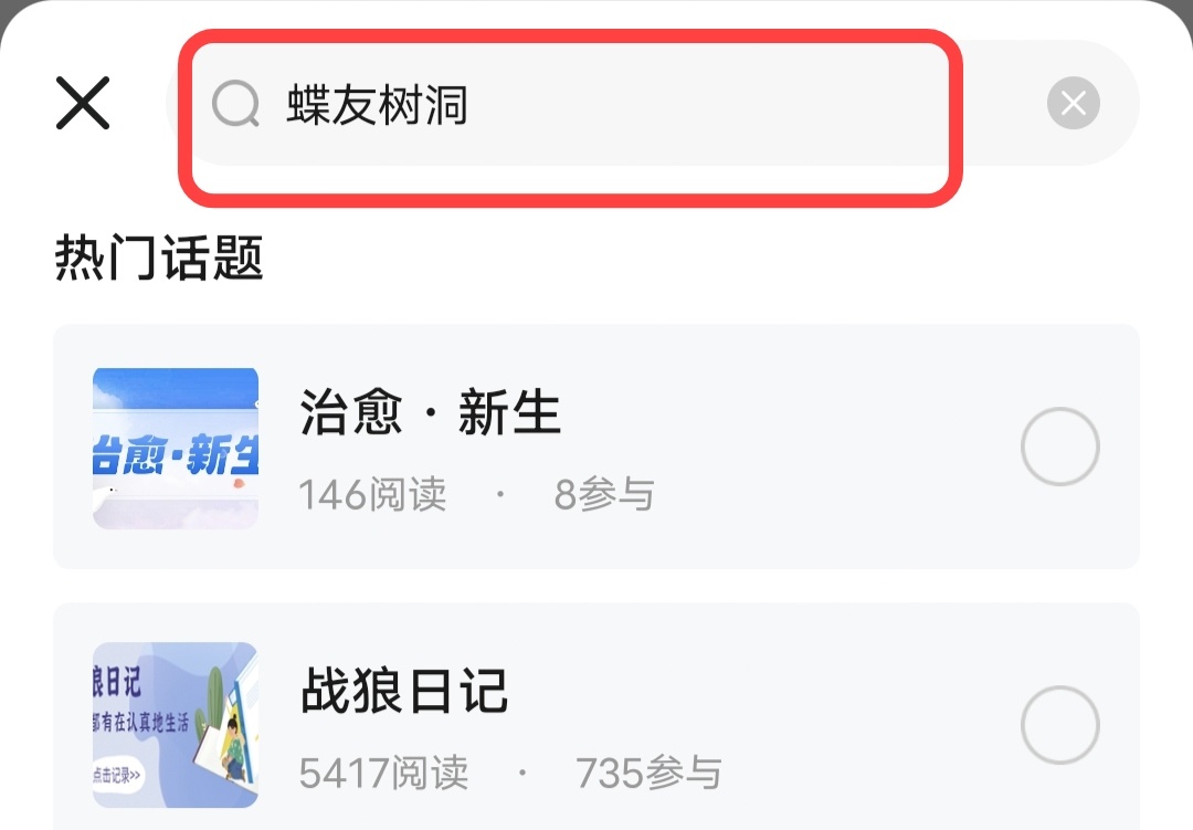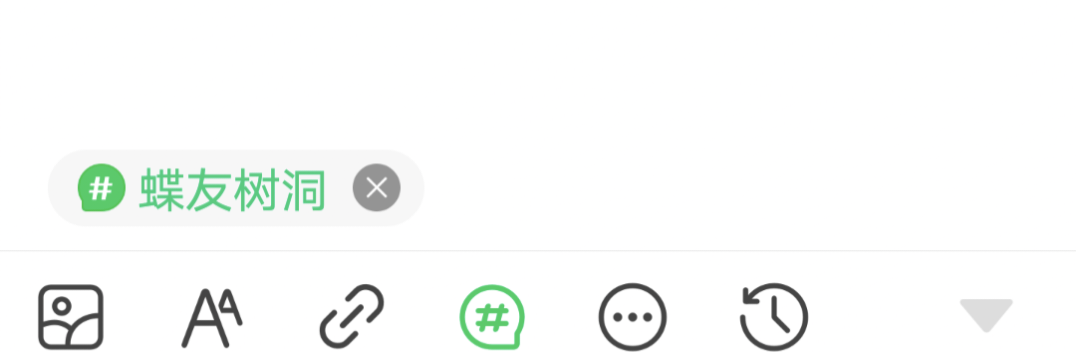 1.直接在发帖页面点击“#”按钮,搜索“蝶友树洞”,选中话题。