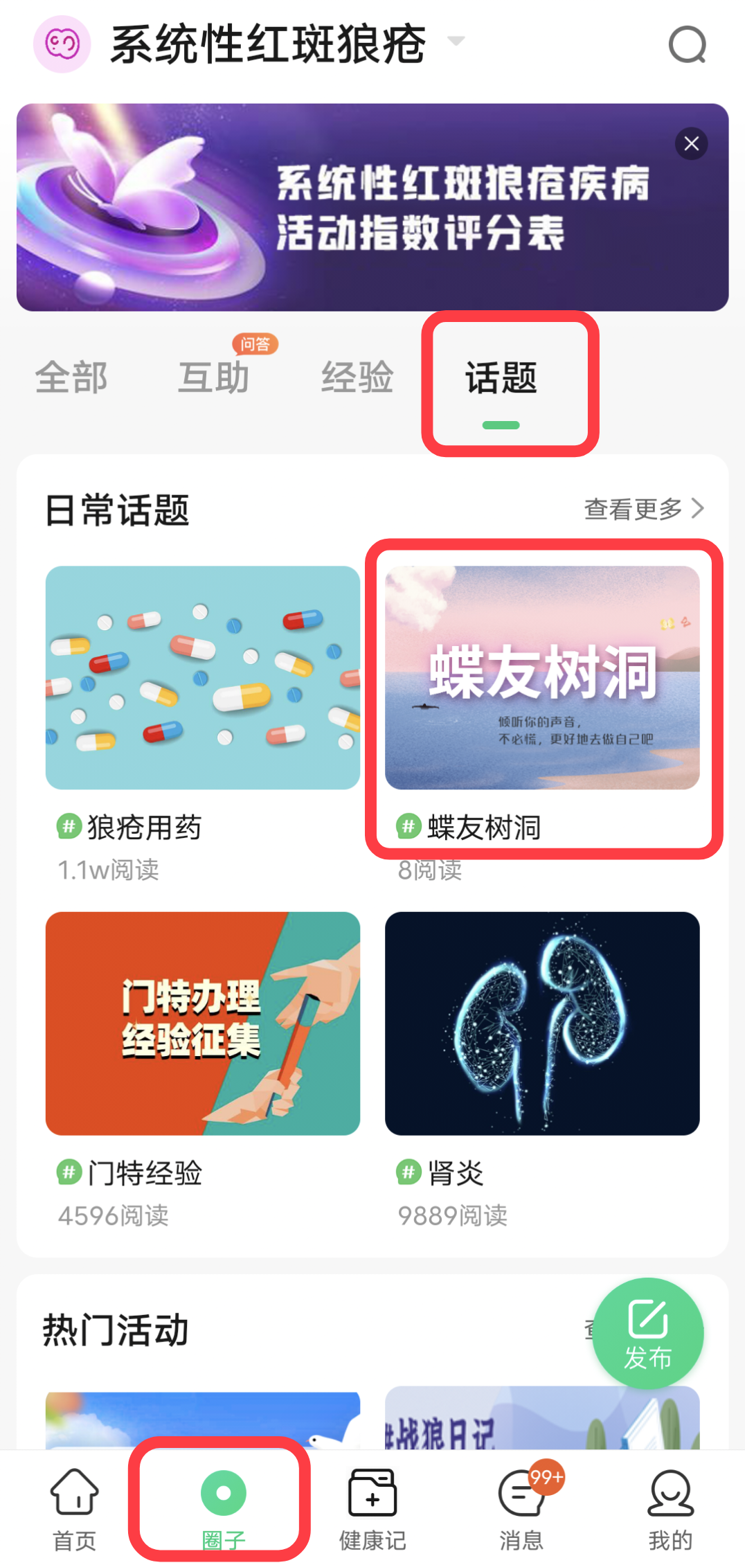 选择底部按钮“圈子”→选择“话题”→选择“蝶友树洞”