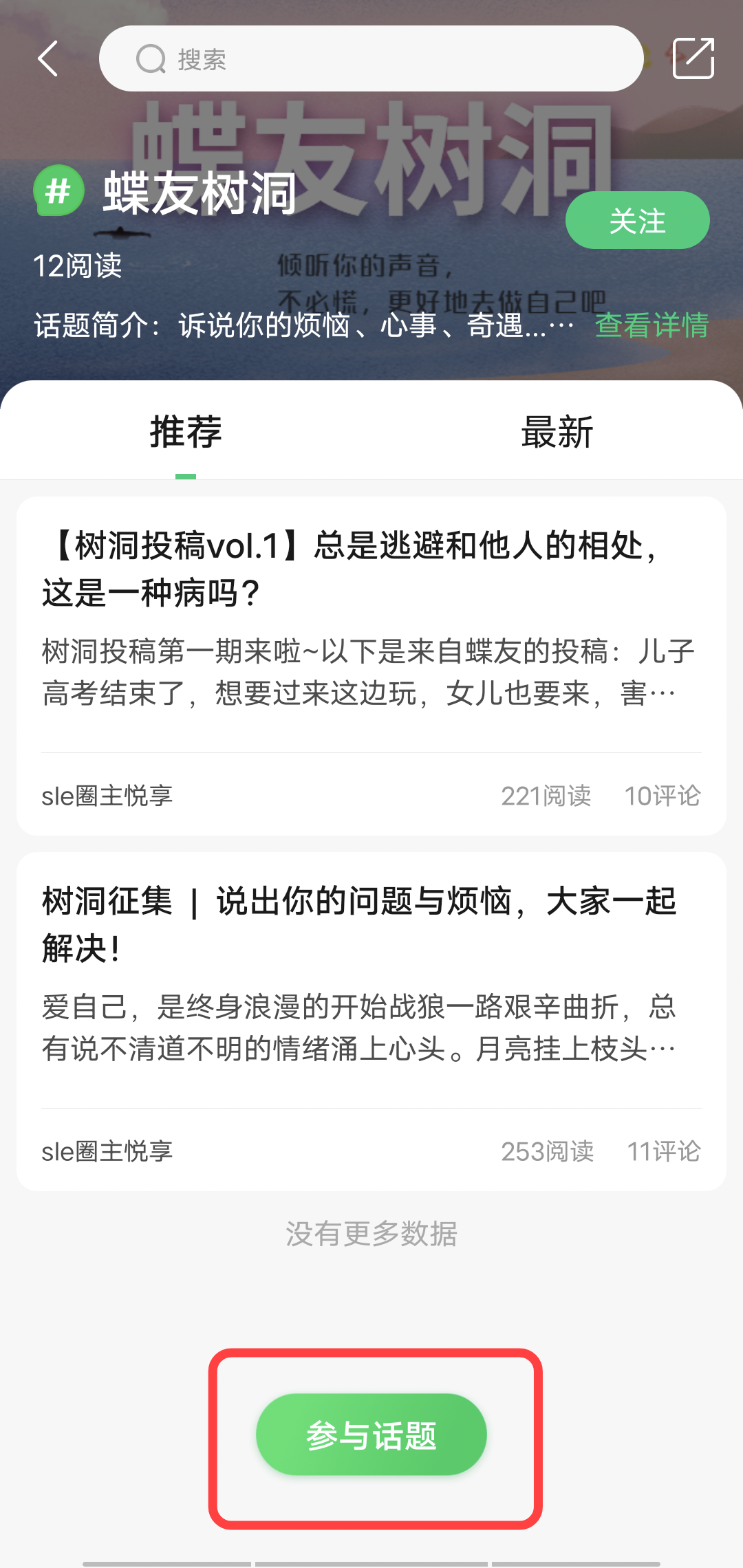 在底部选择“参与话题”即可,在这个页面大家也能看到其他蝶友发布的树洞帖子哦~