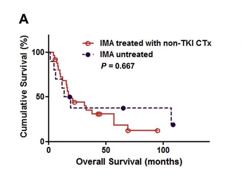 根据一项发布在前沿期刊(影响因子 5.7)的研究统计,IV 期 IMA 患者接受非靶向性的纯化疗(图中红线)对比未经治疗的 IV 期 IMA 患者(图中虚线),几乎没有生存获益。(样本来自 2005-2015年)甚至从图中看,未经治疗的患者总生存时间比接受非靶向性的纯化疗的患者总生存时间更久一些。在接受基于铂类药物的传统化疗方案治疗时,仅有 4.2% 患者达到 PR (即肿瘤缩小)。