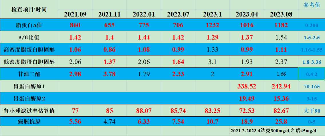 脂蛋白A,A/G,胃蛋白酶,癌胚抗原偏高,高密度脂蛋白胆固醇偏低,肾小球滤过率估算值偏低,开始紧张